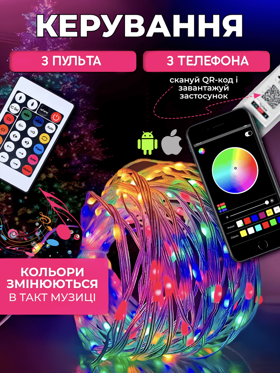 Гірлянда підтримує керування з пульта та смартфона. Просто відскануйте QR-код, завантажте застосунок — і отримайте повний контроль над кольорами, режимами та музичною синхронізацією.
