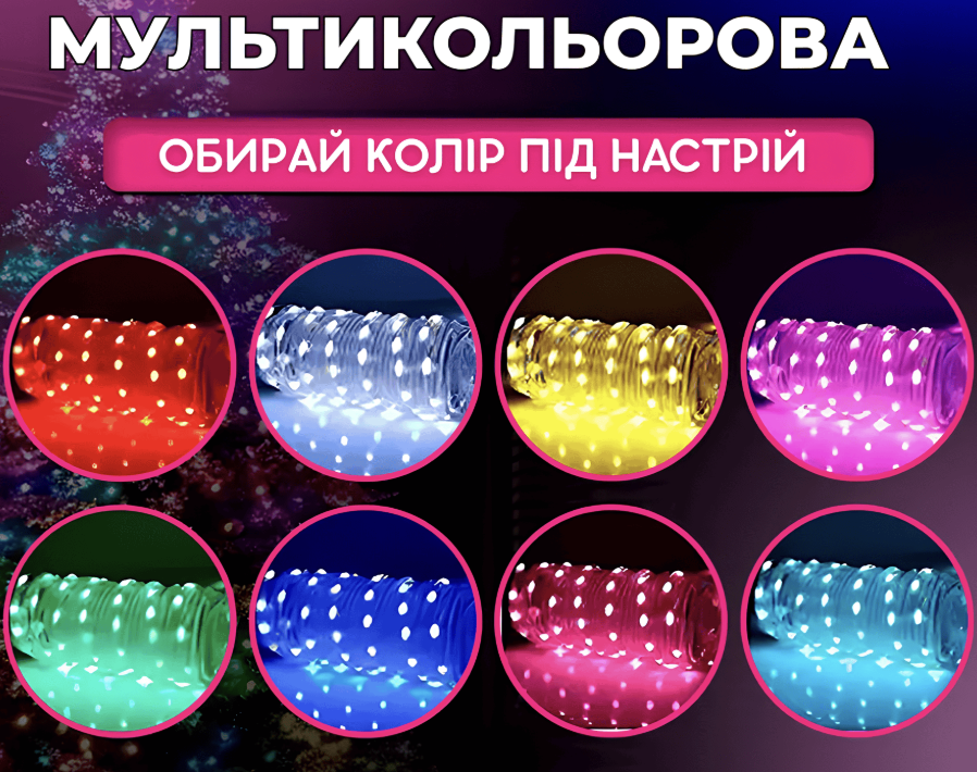 Мультиколірна гірлянда дозволяє легко підібрати колір під ваш настрій. Теплі, холодні, яскраві чи ніжні — обирайте серед десятків варіантів відтінків і створюйте особливу атмосферу у своєму просторі.