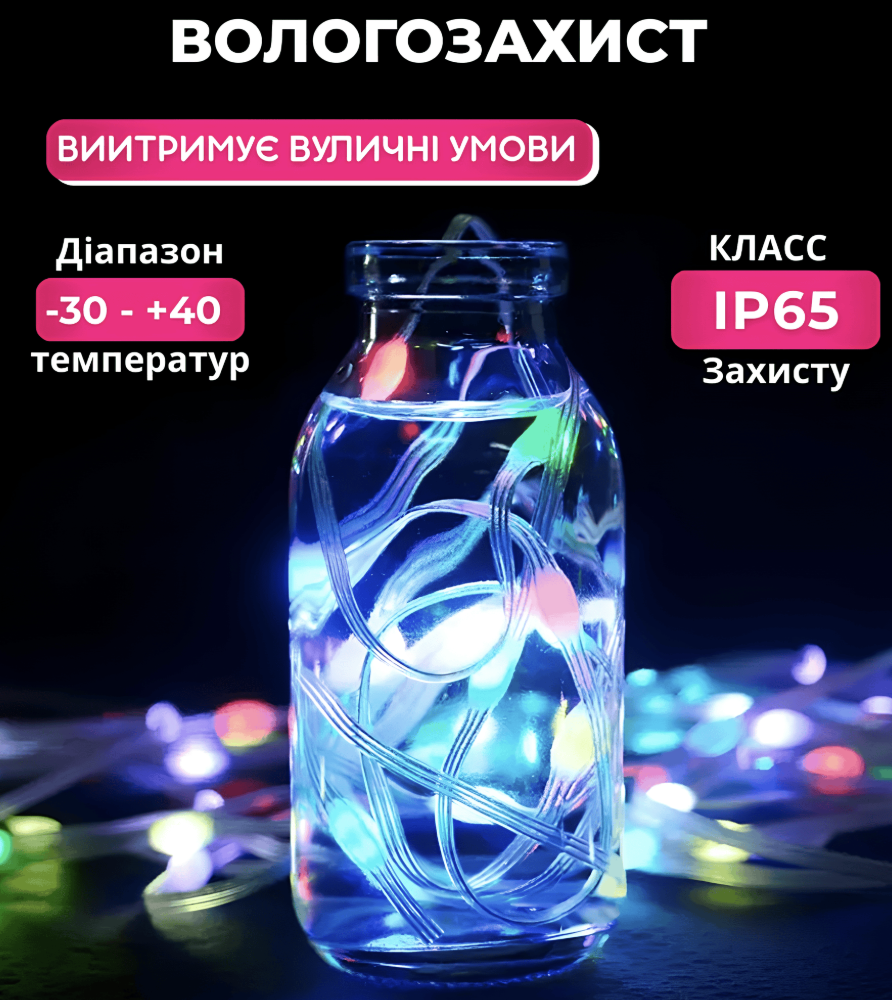 Гірлянда з класом захисту IP65 без проблем працює під дощем та снігом. Витримує температури від –30 до +40°C, тож підходить як для дому, так і для вулиці.